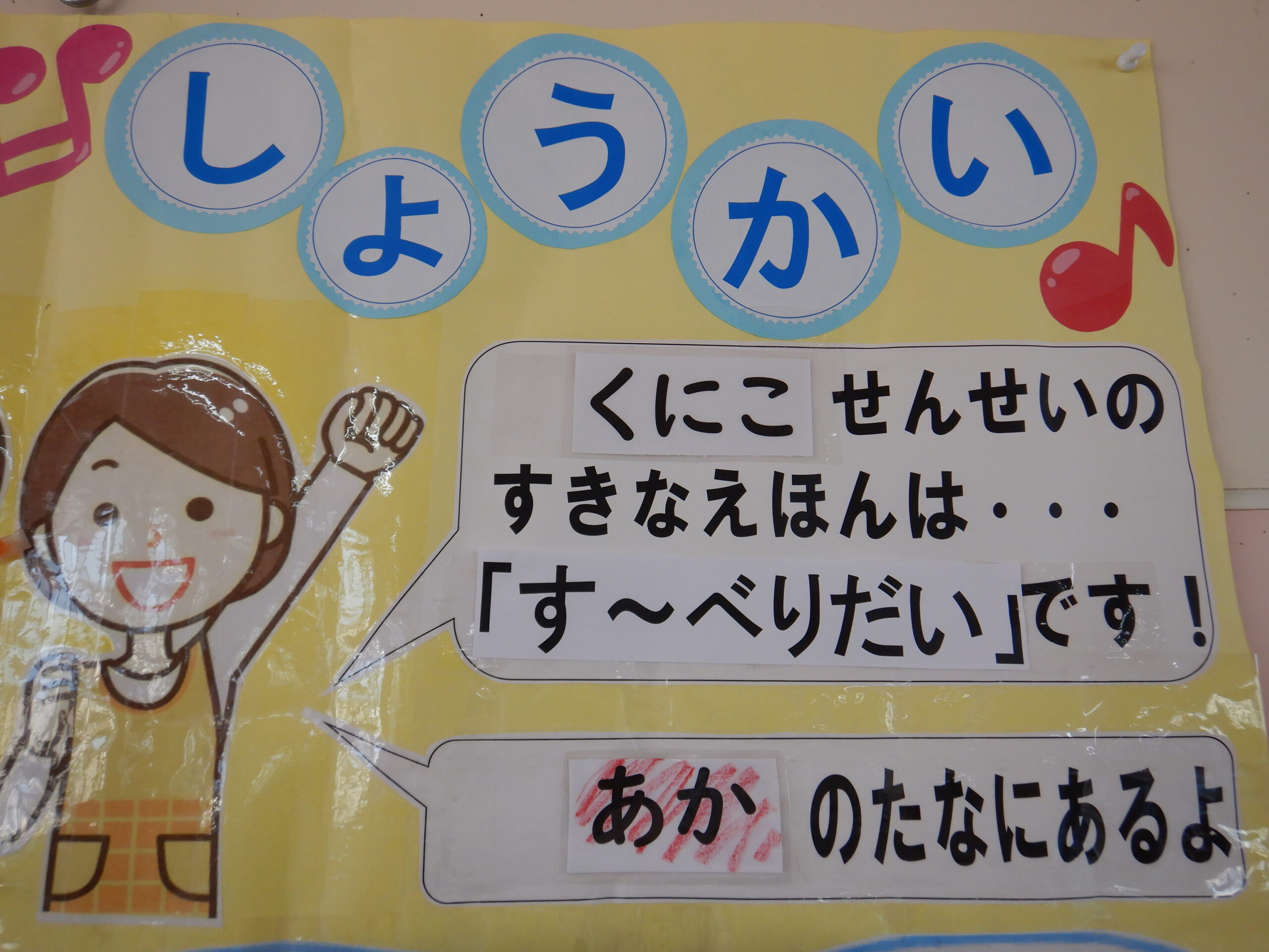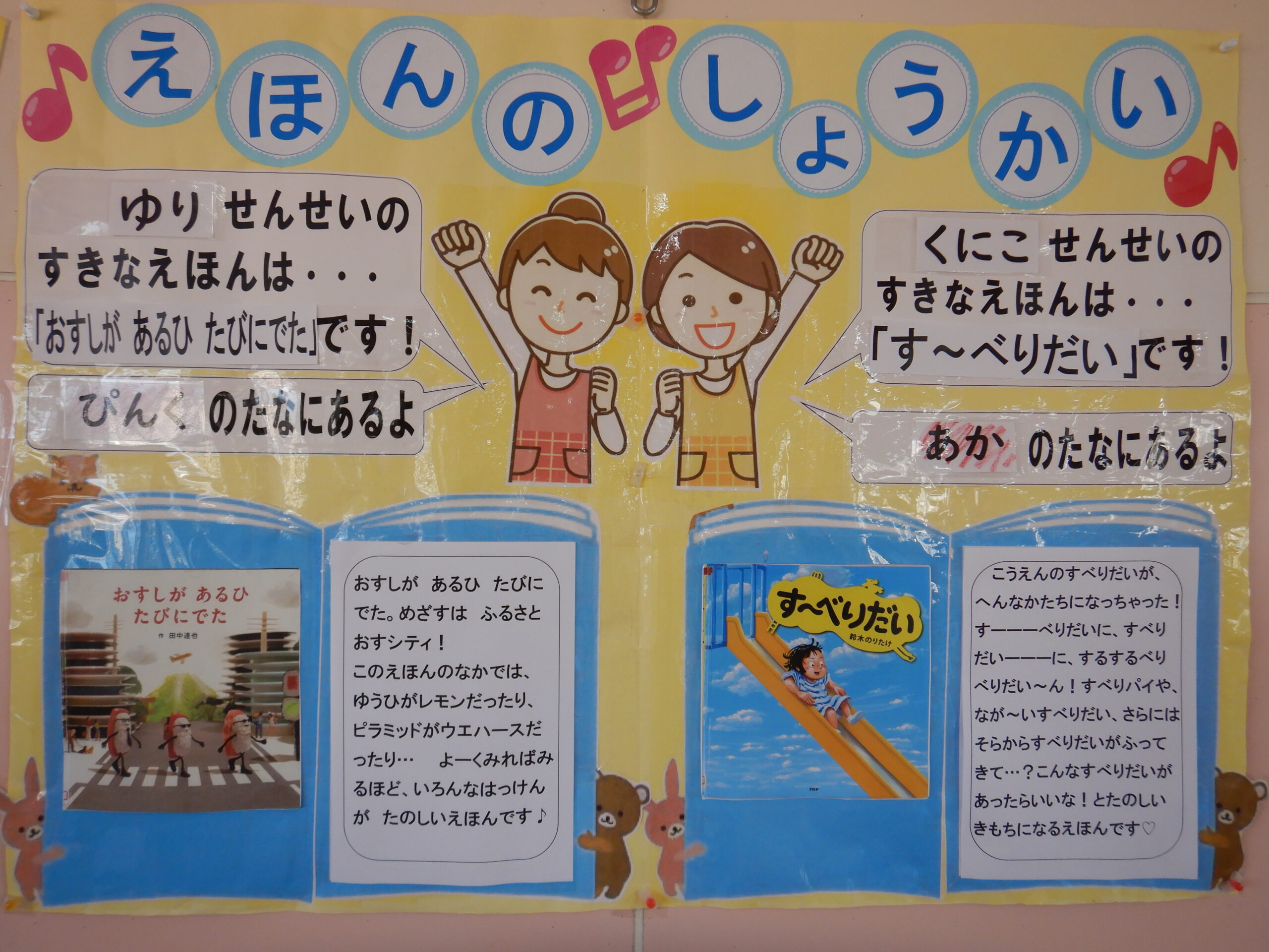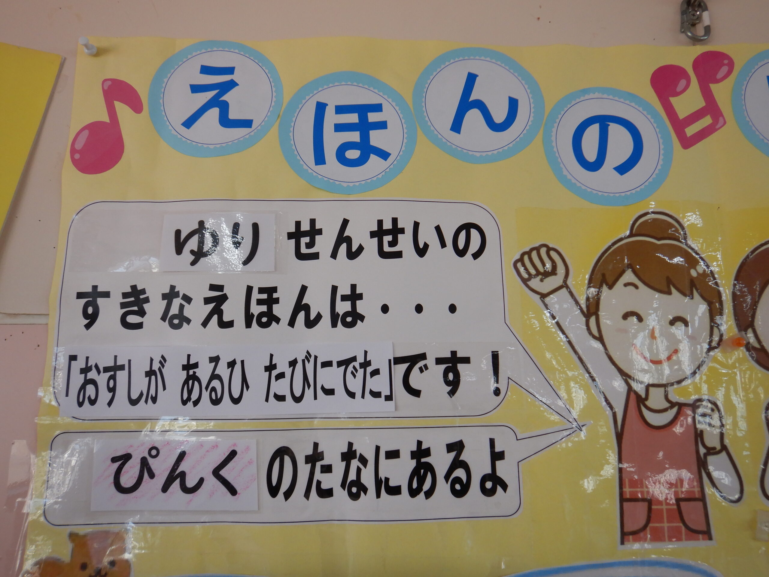 絵本の紹介📚🎶(#1) 2026-04-09 園生活 フォトギャラリー 令和8年度がスタートしました。 園庭に咲く満開の桜が、子どもたちのスタートを優しく応援しているみたいですね🌸 3階、パピールームの絵本のコーナーに、❝先生たちの好きな絵本❞の紹介が掲示してあります。 今年度も、ホームページのフォトギャラリーでお知らせしていきますので、気になる絵本がありましたら是非読んでみてください。 お気に入りのお話や絵本が見つかってくれたら嬉しいです😊 そして今回、絵本を紹介してくれる先生は、ゆり先生 と くにこ先生です。 今年度もどうぞよろしくお願いします。