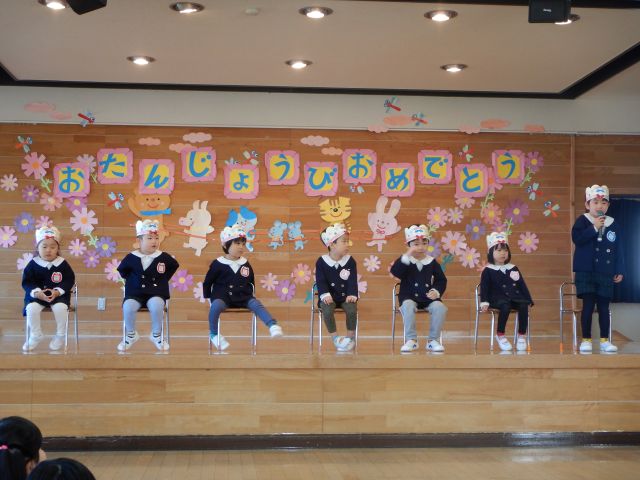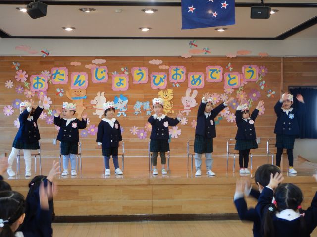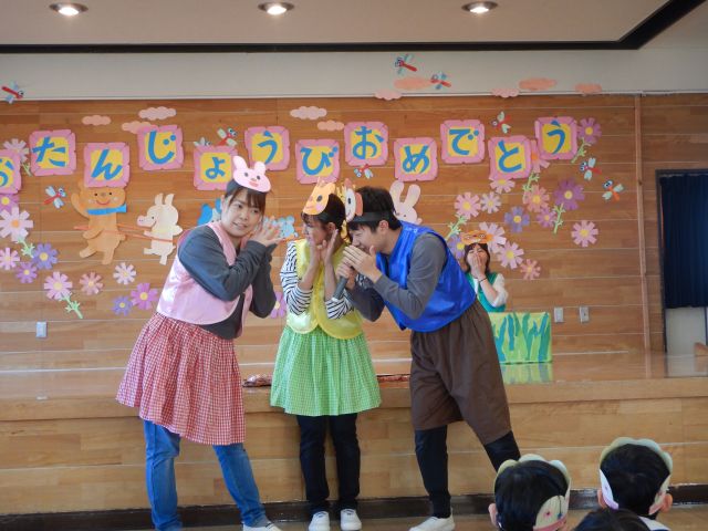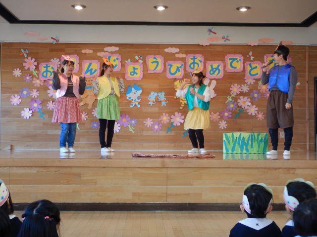 お誕生会にうたう歌は、今月から「ハッピーフレンズ」になりました。「♪きょうは うれしいたんじょうび~」とみんなの素敵な声がステージに届いていましたよ。お誕生カードをもらった後には、先生たちからのプレゼント💖『いたずらたぬきのバスケット』の劇でした。いたずらをしてばかりのたぬきさんに、動物たちはどうしたらよいか考えて…。そんな面白いお話にドキドキしながら見ていた子どもたちでした😄
