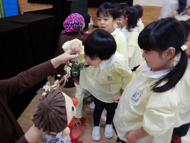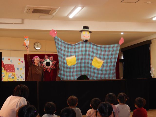 「ちょうちん座」の劇を観ました。いつものホールとは少し違う雰囲気にみんなドキドキワクワク♪はじめは、ちょうちんボードビル『かかしのさんぽ』。ちょうちんが色々なものに変身すると、大興奮の子どもたち!もう一つは人形劇『きらいだもん』。髪の毛を切ることが大嫌いな男の子のお話でした。劇の後には、人形とバイバイしたり、タッチをしたりしてとても嬉しそうな子どもたちでした♪