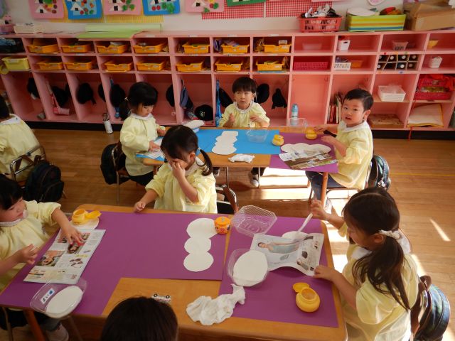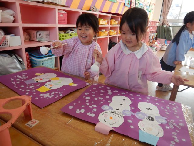 冬の壁面制作でゆきだるま作り!白い画用紙を丸い形に切り、のりで貼り合わせて作りました。丸い形をとても慎重に丁寧に切っていた子どもたち。クレヨンで顔を描いて手袋と帽子を貼ったらかわいい雪だるまが完成!白色の絵の具スタンプを「ポンっ」と押すと、雪に変身!面白くてたくさんスタンプを押していました。雪が降るのが楽しみですね♫