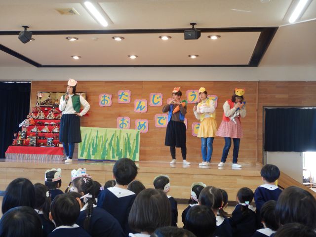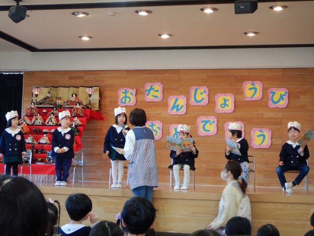 ステージに飾られたひな人形とお友だちに温かく見守られながら嬉しそうに入場してきたお誕生日のお友だち。嬉しい気持ちと少しドキドキした気持ちと様々な表情が見られましたが、みんな上手に自己紹介をしていました♪