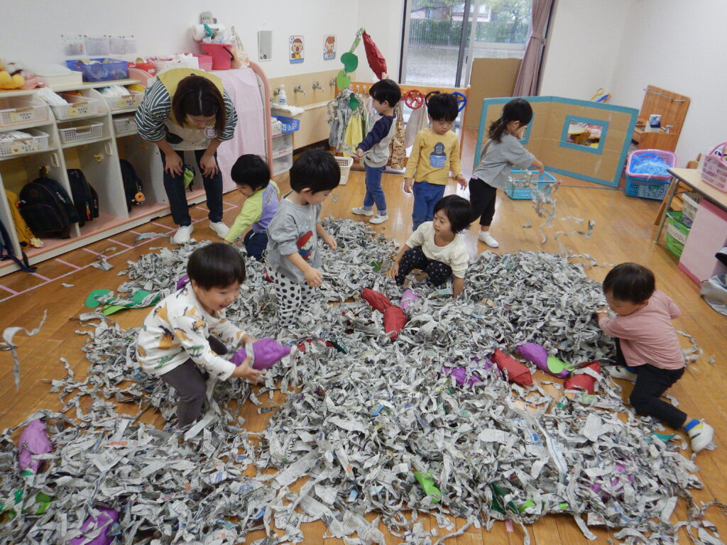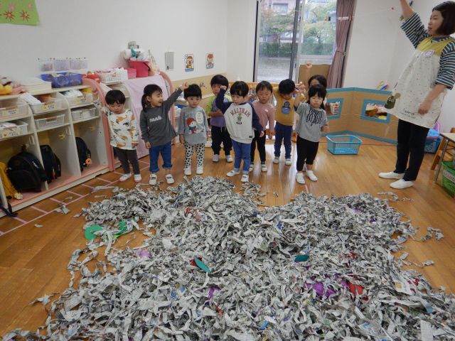 いもほりごっこの後は…大好きな新聞紙あそび♪さらに大興奮のりんご組さんでした♡楽しかったね!