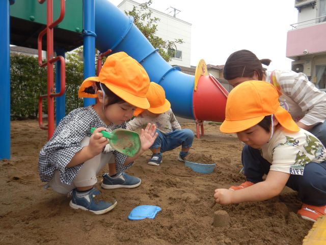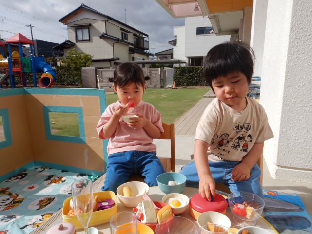 友だちや保育者と一緒に好きなあそびを楽しんでいるりんご組さん♡友だちのしていることを真似て、「一緒だね♡」と微笑み合ったり、「よせて」と言って仲間に入ったり…友だちとの関わりを楽しんでいます♪