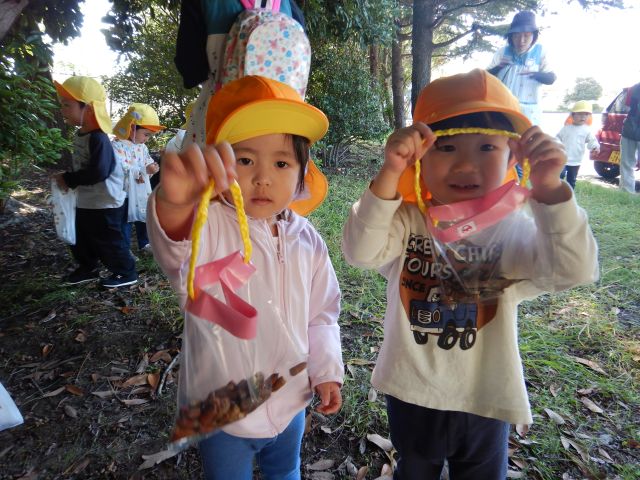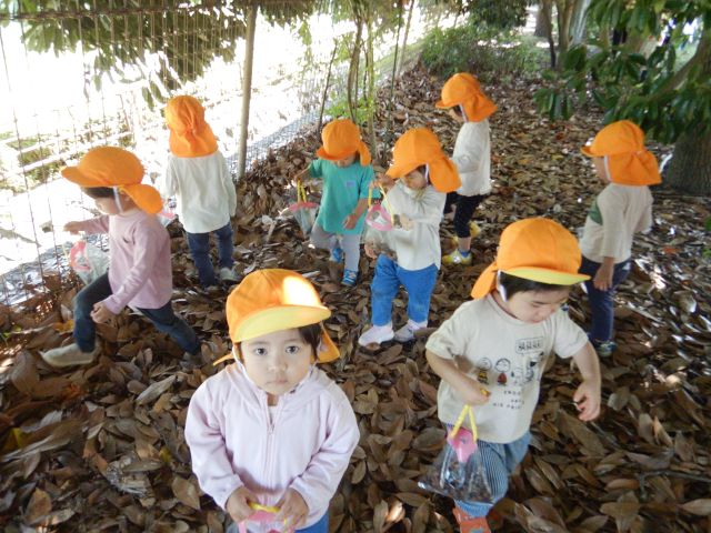 どんぐりを見つけると、「あった!」と大喜び♡たくさん拾って「先生見て~!!」と見せに来てくれたり「ここにあったよ!」とお友だちに拾ってあげたり微笑ましい姿も見られました。どんぐり拾いの後は、落ち葉の上をお散歩♡秋ならではのあそびを楽しんできました♪