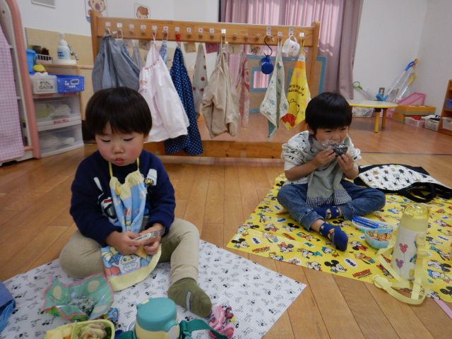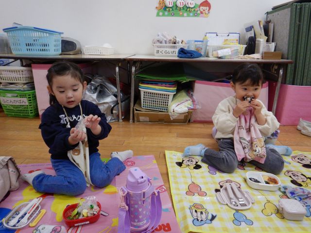 「お弁当持ってきたよ~♪」と朝からウキウキ♪のりんご組さん♡みんなで輪になって美味しくいただきました♡朝早くからご用意ありがとうございました!!
