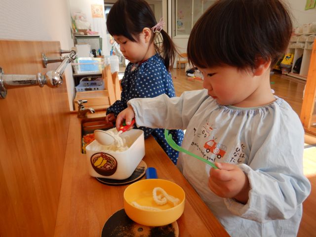 ごちそうをお皿に盛りつけたり、フライパンで炒めたり…「はいどうぞ♡」と出来上がったごちそうやお弁当をお友だちや保育者の所に持て来てくれます♡「美味しい♡」と言うと、とびきりの笑顔☺を見せてくるりんご組さんです♡