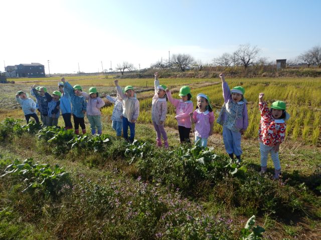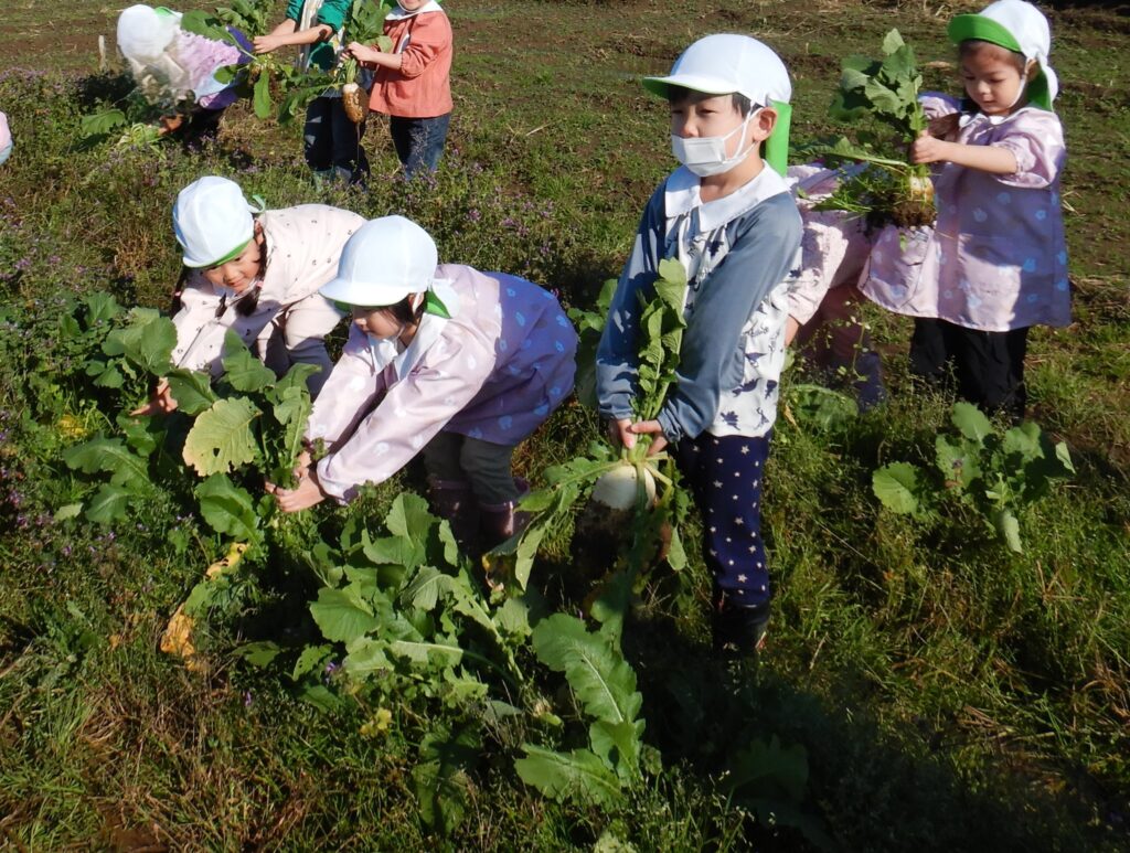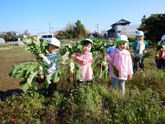 11月27日に今まで育ててきた大根を収穫しました。前々から「収穫はいつ?」「早く持って帰りたーい♪」と楽しみにしていたすみれぐみさん。べジ畑に着いて、自分が気に入った大根を選び、ワクワクしながら大きくなった葉っぱを引っこ抜くと様々な大きさや形の大根が顔を出しました✨「でっかーーい!」「みて!二つくっついてた!」「赤ちゃん大根だ!かわいい♡」など、嬉しそうな子どもたちの声が聞こえてきましたよ♪後日、「おでんにして食べた♡」「大根サラダにしたよ!」と、お家で美味しく食べたお話がたくさん聞かれました😊