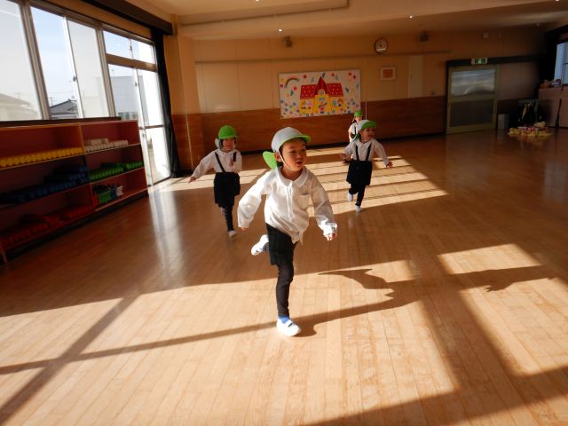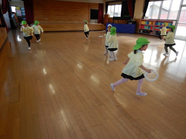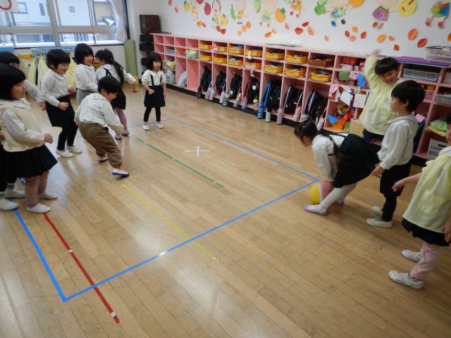 冬の寒さに負けず、ホールでは「氷鬼」、お部屋では長繩跳びや転がしドッジボールをして元気に体を動かして遊ぶことを楽しんでいます。長繩跳びは、両足ジャンプで連続して跳べると嬉しそうにニッコリ😊転がしドッジボールは、コートの中ではボールから逃げ、コートの外から中の人を狙ってボールを転がし、みんな大興奮✨一生懸命動き、みんな汗をかくほど楽しんでいます!室内でも、たくさん体を動かしながらみんなで一つのあそびを楽しんでいきたいと思います♪
