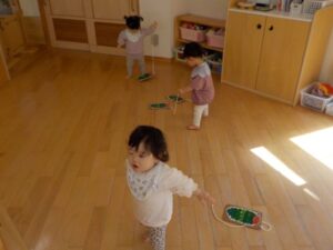 保育室には楽しいおもちゃがいっぱい♪ お気に入りの玩具を見つけて遊んだり、みんなで風船あそびをしたりして楽しんでいます。 友だちと同じおもちゃに興味を持った時には、隣に並んで同じあそびをしている様子があります。 かわいら […]